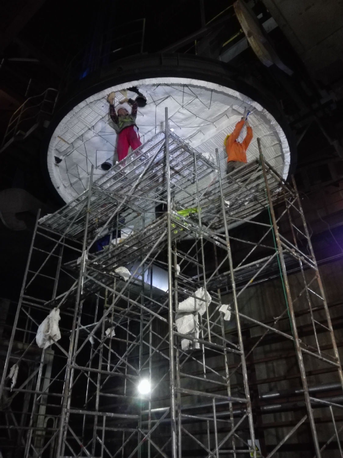 干熄焦焦罐蓋耐火隔熱材料最早采用不銹鋼網(wǎng)固定的方式,而在實際應(yīng)用,不銹鋼網(wǎng)易氧化脫落致使干熄塔不能工作。公司與配套廠家經(jīng)多次試驗最終確定采用含鋯型陶瓷纖維模塊,固定用螺栓包在隔熱材料內(nèi),離熱面還有一段距離,解決了高溫氧化問題,該方案在給國外客戶提供的提升機(jī)中得到了國外客戶肯定,并延用至今。