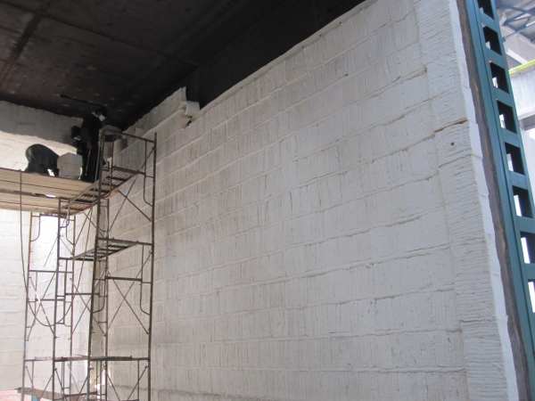 爐頂與爐墻結(jié)合部位密封處理:爐頂與爐墻連接處是襯里的薄弱區(qū),容易形成漏氣或竄火,使爐襯的保溫效果降低,同時影響爐襯的使用壽命。為防止該部位出現(xiàn)貫通縫,墻與墻、墻與頂?shù)倪B結(jié)處采用陶瓷纖維模塊與陶瓷纖維背襯毯錯縫連結(jié)方式。同時為防止熱面層陶纖模塊連結(jié)處的高溫收縮,在墻頂結(jié)合處設(shè)置一條補償縫,采用與模塊同等材質(zhì)纖維毯對折,保持30%以上的壓縮比,強行塞入,確保該部位的高溫密封效果。爐墻與爐頂連接處處理如下圖: